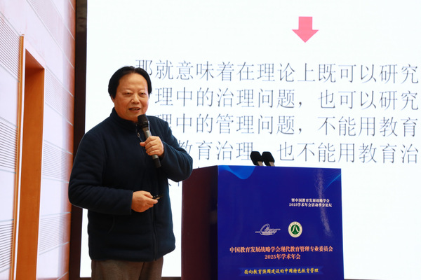 孙绵涛作题为《从管理到治理:新时代教育管理学发展面临的新选择》的主题报告。他从新时代教育管理学为何需要从管理转向治理、面临怎样的转向选择,以及如何实现这一转向三个核心问题出发,结合对古今中外理论观点及“治理”原意的深入剖析,系统阐述了中国教育管理学在创新发展过程中面临的主要问题、成因及其破解路径。孙绵涛指出,新时代教育管理学实现从教育管理向教育治理的转型,应建立在全面把握“治理”原意的基础之上。他强调,这种教育治理既包含平等协调、多元共治的现代内涵,也涵盖必要管理与规范约束的维度,是一种兼具包容性与层次性的理论演进与实践转向。