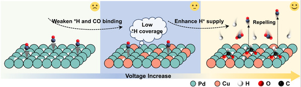 第一个工作系统研究了碳酸氢盐电解质在Pd催化CO2电还原制甲酸过程中的供质子能力,揭示了甲酸生成的两条途径:质子耦合电子转移(PCET)和化学加氢(CH)的竞争路径与表面氢覆盖度密切相关。利用阳极伏安扫描曲线量化了Pd(合金)在不同电解质中的表面氢吸附和晶格氢吸收特性,确定了电负性诱导的PdCu双金属中心上的CO毒化动力学。结合原位红外光谱与差分质谱技术,从实验上确认了高浓度碳酸氢盐电解质有利于维持较高的*OCHO中间体覆盖度,通过增强表面氢吸附而非亚表面氢吸收,从而在更宽的电位区间阻碍CO毒化物种的形成。该研究成果发表于化学领域顶级期刊 Journal of the American Chemical Society(doi: 10.1021/jacs.5c04023)。论文通讯作者包括化材学院杨发、李正全,含氟新材料研究所陈德利和地环学院王爱军老师,吕旭宇、罗婷和吕超硕士生为共同第一作者。相关表征测试得到了光电子研究院谢云龙、周靖、尹悦老师的大力支持。浙江师范大学为唯一通讯单位。