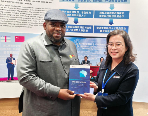 张建珍代表浙师大与联合实验室向阿布巴卡尔赠送了《非洲科技发展与科技组织》一书,以此象征双方友谊,助力中莫农业科技合作迈向更深层次、更广领域。
