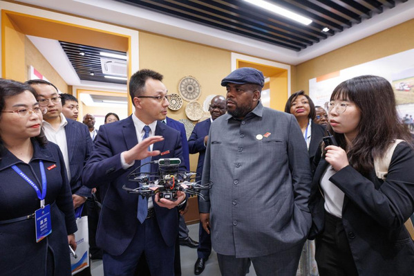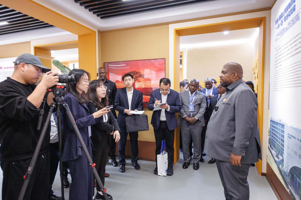 莫桑比克解放阵线党总书记阿布巴卡尔在实验室展厅接受《中国日报》采访。图片来源 地环学院