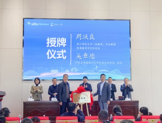 浙师大向齐溪镇中心学校授予“浙江师范大学智慧教育研究院基地校”牌匾。图片来源 继续教育处