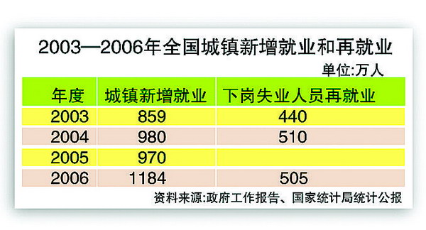 2006年,中央财政安排就业再就业资金234亿元。多渠道开发就业岗位,帮扶“零就业家庭”和就业困难人员,505万下岗失业人员实现了再就业。全国城镇新增就业1184万人。