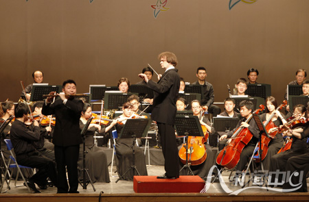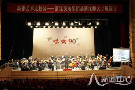 (校新闻中心学生记者团 黄金静 赵多加)从激情澎湃的管弦乐曲《红旗颂》到深沉浑厚的男高音独唱《满江红》,再到表现人民争取解放的交响乐《芬兰颂》……5月9日晚,一场以爱国主义为主题的交响音乐会在音乐厅举行,浙江交响乐团二度来校,为我校师生奉上了一曲曲激越人心的革命赞歌。