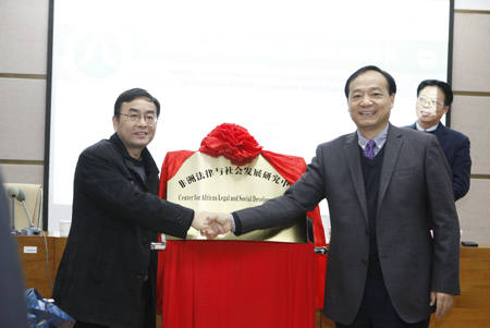 中国法学会学术交流中心主任尹宝虎、副校长张根福共同为非洲法律与社会发展研究中心揭牌。