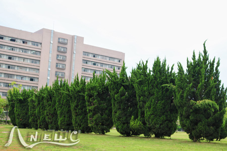 精业楼后面草坪上的树被修剪成“佛手状”,趣意盎然。