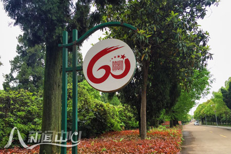 各个角的路牌上印着“60”字样和校庆徽章。