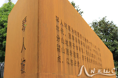 校园西区的体育馆前,琴人坡静静诉说着过往的故事。