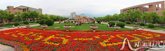正大门校训石前的花圃被摆放成“1956-2016”的字样。