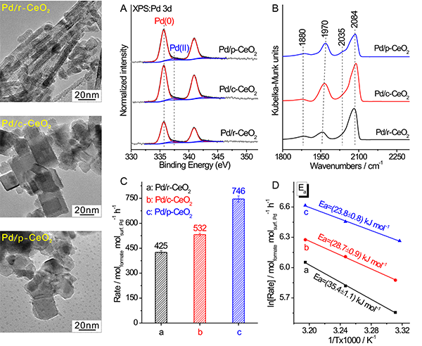 该研究工作通过制备不同形貌CeO2纳米晶(分别为纳米棒状、纳米立方体和纳米多面体)负载金属Pd的催化剂,系统研究了Pd-CeO2相互作用及其对CO2加氢成甲酸盐反应性能的影响。研究发现CeO2表面的氧空位浓度决定着Pd-CeO2之间的相互作用,进而影响着Pd粒子的尺寸和电子结构。具有较高表面氧空位浓度的纳米棒状CeO2(r-CeO2)与Pd之间的金属-载体相互作用(MSI)更强,导致Pd/r-CeO2上形成更小的Pd纳米粒子和更正价态的Pd物种。