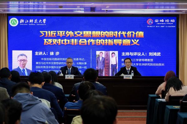 4月15日晚,中国国际问题研究院院长、党委书记,习近平外交思想研究中心主任徐步大使莅临浙师大作客“尖峰论坛”,畅谈“习近平外交思想的时代机制及对中非合作的指导意义”。国家级领军人才、浙师大非洲研究院院长刘鸿武主持讲座。