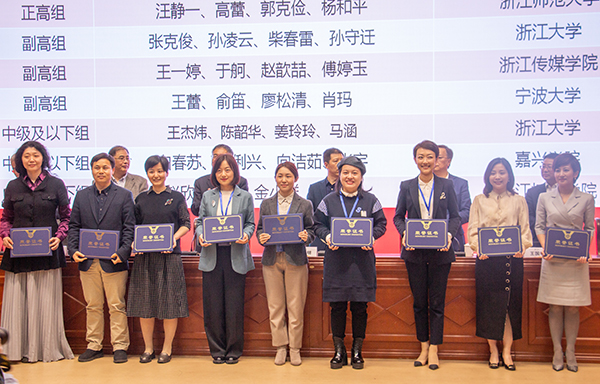 瞿佳宣读获奖名单。此次大赛最终决出特等奖9个,一等奖15个,二等奖33个,教学设计创新奖、教学学术创新奖、教学活动创新奖各6个,优秀组织奖23个。浙师大音乐学院汪静一团队获特等奖(正高组)和教学设计创新奖(专项),幼儿师范学院于淳团队获一等奖,人文学院王倩获三等奖;外国语学院章莉获“课程思政”微课专项大赛文科组一等奖,数学与计算机科学学院丁智国获理科组三等奖。浙江师范大学获优秀组织奖。