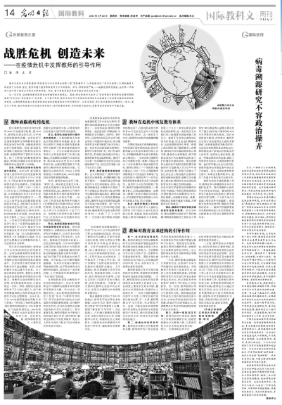 4月22日,《光明日报》整版刊发潘涌教授和研究生王彦合作撰写的专题文章《战胜危机 创造未来——在疫情危机中发挥教师的引导作用》。