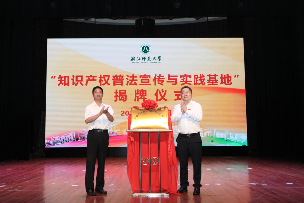郑孟状与金华市中级人民法院党组副书记、副院长宋耿金为“知识产权普法宣传与实践基地”揭牌。