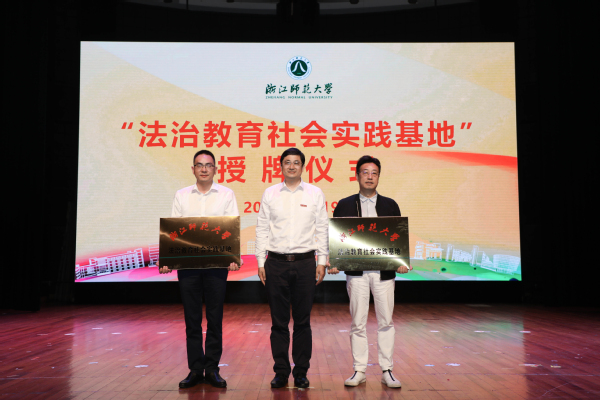朱坚为“法治教育社会实践基地”授牌,北京盈科(金华)律师事务所管委会主任、金华市律师协会副会长严亮奇,浙江杰正律师事务所副主任赵李文上台接受授牌。