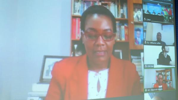 肯尼亚教育部政策与合作部处长卡维拉•兹博拉女士(Ms. Kawira Zipporah)作为全体研修学员代表发言。她感谢中国商务部和浙江师范大学提供此次培训机会,认为此次研修班课程紧扣高等教育管理主题,对及时推动非洲各国高等教育领域的发展有着积极的影响。卡维拉•兹博拉女士表示,虽然因为疫情原因不能来华研修,但仍然非常期待能够充分利用此次机会,借鉴浙师大相关教学管理经验,提升非洲国家的教育实践,也期待能与中方高等院校和职业院校保持沟通,并拓展教育、科学和技术领域的合作。