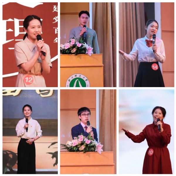 人文学院学生邵美祺同学以教师初心故事为引,讲述浙师青年步履不停,隔空应答百余年前梁启超先生“少年强则国强”的呼喊,努力完成历史使命的交棒和奉献精神的赓续。马克思主义学院张姝嘉同学深情讲述共产党人的爱情与家国情怀,以及隐藏在红色爱情下的信仰与力量,激励新时代的青年爱侣,为实现共同理想信念而携手并进,为创造幸福美好生活而矢志不渝。