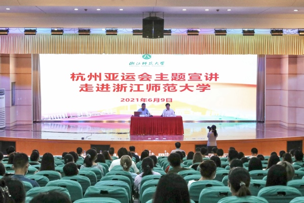 6月9日下午两点,亚运主题教育宣讲在浙江师范大学大学生活动中心举行。亚组委机关党组成员、纪检监察和审计部部长陈忆,亚组委纪检监察和审计部副部长谢宁,浙师大有关部门负责人和学生代表参加活动。浙师大党委委员、宣传部部长朱毅峰主持宣讲会。