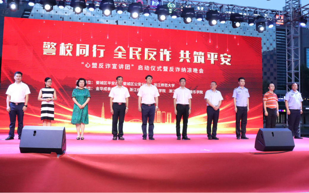 7月8日晚,“心盟反诈宣讲团”启动仪式暨反诈纳凉晚会活动在人民广场举办。浙江师范大学党委副书记朱坚,婺城区委副书记、政法委书记胡小荣出席活动。