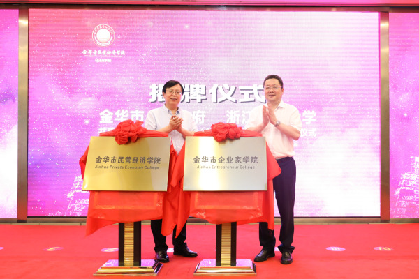 邢志宏与郑孟状为金华市民营经济学院(企业家学院)揭牌。
