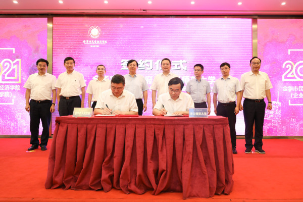 张新宇与张根福分别代表金华市人民政府和浙江师范大学签署共建民营经济学院(企业家学院)协议。