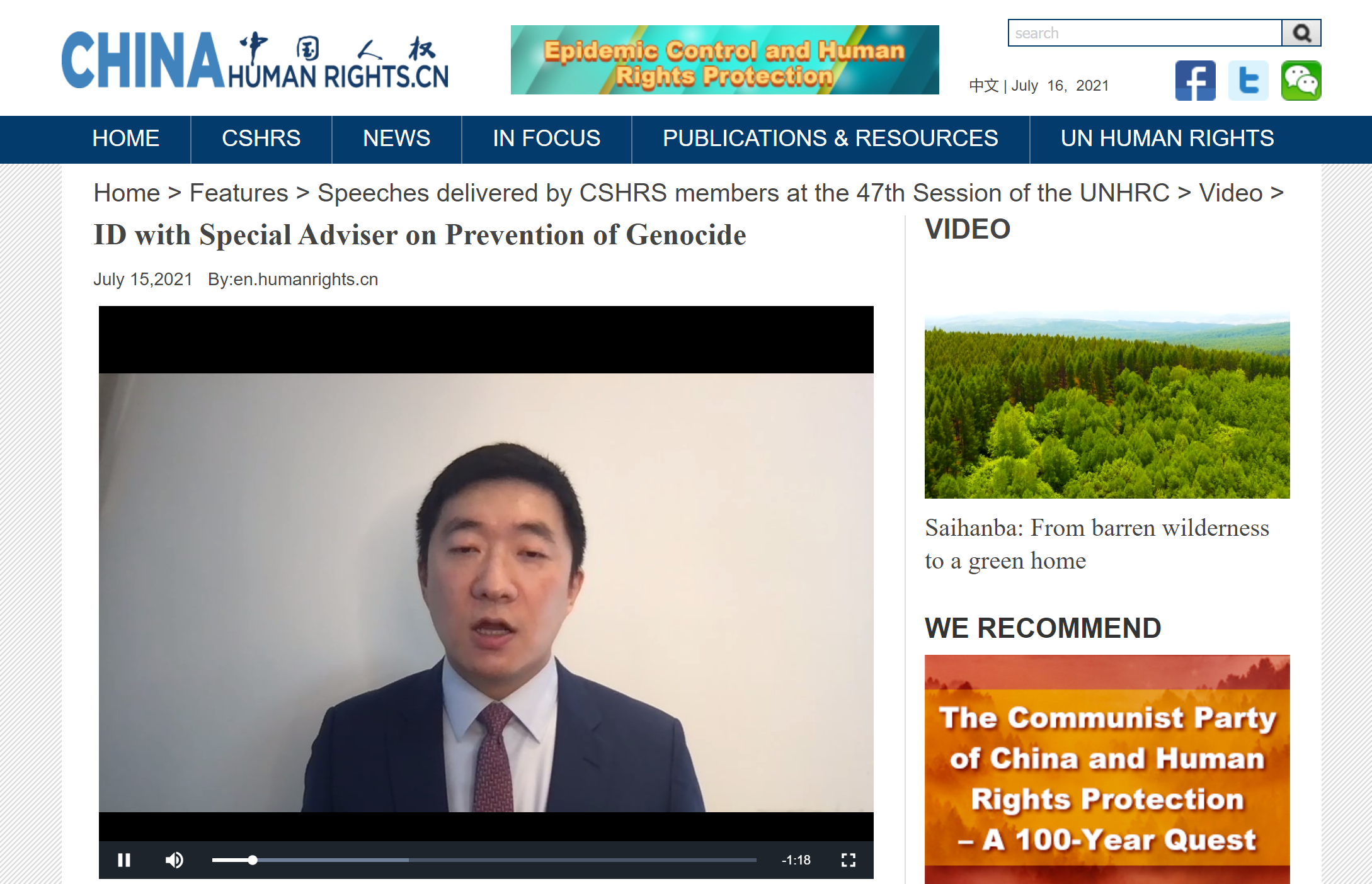 受中国人权研究会邀请浙江师范大学边疆研究院特聘研究员王江远程参会,并在对话互动环节围绕“与防止种族灭绝问题特别报告员互动对话”“与法官和律师独立性问题特别报告员互动对话”提交两份视频发言,积极宣介我国人权理念和成就,驳斥反华敌对势力对我国的攻击污蔑。