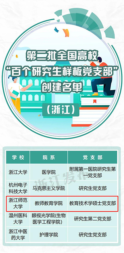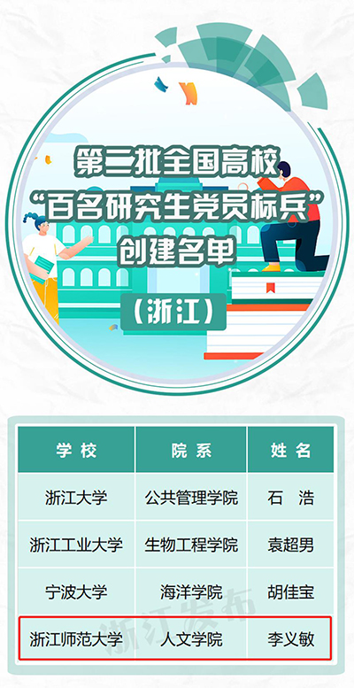 近日,教育部办公厅公布了第二批全国高校“百个研究生样板党支部”和“百名研究生党员标兵”创建名单,浙江5个研究生党支部和4名研究生党员上榜。其中,浙江师范大学教师教育学院教育技术学硕士党支部入选“百个研究生样板党支部”,人文学院李义敏入选“百名研究生党员标兵”。
