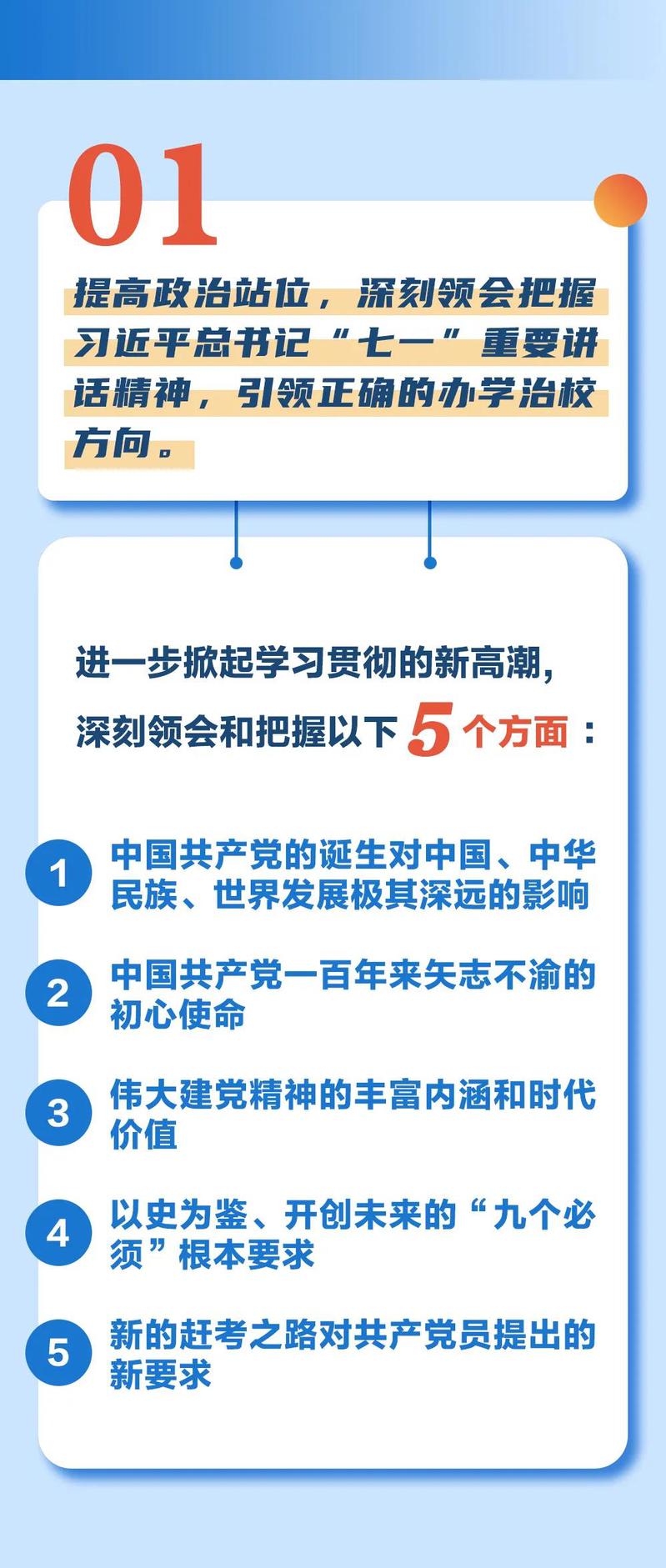 蒋国俊指出,深入学习贯彻落实习近平总书记“七一”重要讲话是当前和今后一个时期的重要政治任务。我们要提高政治站位,深刻领会把握习近平总书记“七一”重要讲话精神,引领正确的办学治校方向。要认真组织学习,结合《中国共产党的历史使命与行动价值》,深刻领会习近平总书记“七一”重要讲话的丰富内涵、核心要义、实践要求,进一步掀起学习贯彻的新高潮。特别要深刻领会和把握中国共产党的诞生对中国、中华民族、世界发展极其深远的影响,进一步读懂中国共产党为什么能、马克思主义为什么行、中国特色社会主义为什么好;要深刻领会和把握中国共产党一百年来矢志不渝的初心使命,进一步激发为实现中华民族伟大复兴而奋斗的信心和动力;要深刻领会和把握伟大建党精神的丰富内涵和时代价值,进一步赓续传承、发扬光大,为干事创业注入最深层、最持久的力量;要深刻领会和把握以史为鉴、开创未来的“九个必须”根本要求,进一步加强党的领导、推进党的建设、推动社会主义现代化;要深刻领会和把握新的赶考之路对共产党员提出的新要求,进一步发扬斗争精神、增强斗争本领,唯实惟先、善作善成,引导和激励全校师生争先创优、勇开新局。