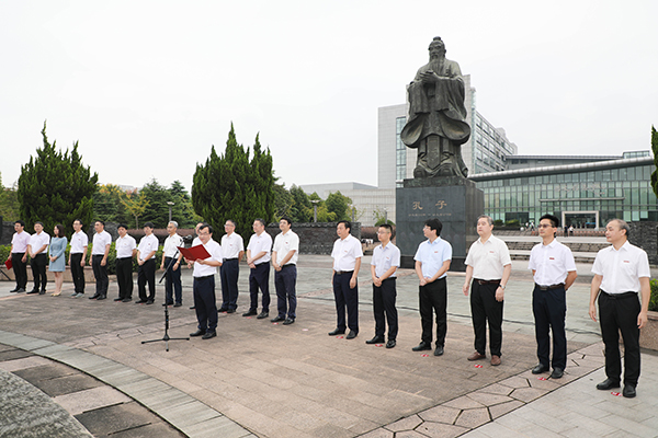 “我志愿成为一名光荣的浙江师范大学教师,弘扬师道理想,传承校训精神,弘毅爱国,厚德爱生……”9月8日上午,浙江师范大学120余名新进教师代表身着红、黄色统一服装,面向国旗,高举右手,在学校崇师广场的孔子像前庄严宣誓。