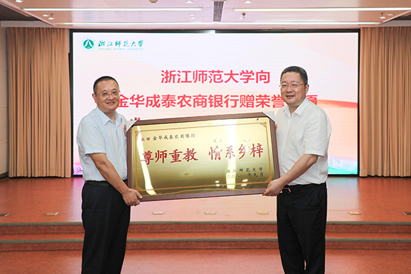 郑孟状代表浙江师范大学向金华成泰农商银行赠荣誉牌匾。