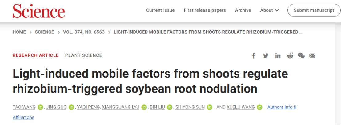 10月1日,浙师大生化学院青年博士王涛以第一作者,浙师大作为第二单位在Science上以Research Article形式在线发表了题为Light-induced mobile factors from shoots regulate rhizobium-triggered soybean root nodulation的研究论文。该研究揭示了光信号通过诱导大豆地上组织合成TGACG-motif结合因子3/4(GmSTF3/4)和 FLOWERING LOCUS T (GmFTs)蛋白,并将这两个蛋白长距离转运至根中从而调控大豆根瘤发育。