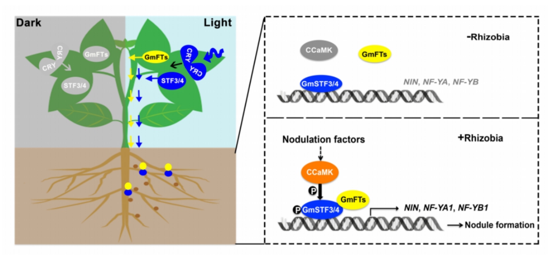 研究人员将根瘤菌侵染大豆的过程分解为侵染线的形成与根瘤起始两个步骤,利用光暗处理、地上地下遮光处理、不同光质处理、光信号转基因植株以及不同处理条件下叶片和根组织中光合产物含量等研究发现光合产物和光信号在调控共生结瘤过程中的作用不同,光合产物是促进根瘤菌侵染植物所必需的,但是来自地上的光信号是促进大豆地下根瘤发育的关键因子。研究揭示了大豆中受光诱导的蛋白GmFTs和GmSTF3/4,从地上移动到地下,在根中相互依赖促进根瘤形成。进一步通过质谱、分子生化和遗传分析证明,共生信号通路关键组分CCaMK被根瘤菌激活后通过磷酸化GmSTF3/4,促进GmSTF3/4和GmFTs互作。GmFTs-GmSTF3/4能够直接激活根瘤起始关键基因NIN、NF-YA1和NF-YB1的转录,从而调控根瘤形成。