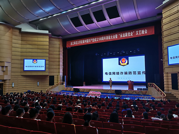 党史学习教育以来,保卫处面向全校师生员工进行反诈讲座培训,发放反诈宣传资料5万余份,实现反诈宣传覆盖率100%;通过“浙师平安校园”微信公众号推送多篇防诈骗安全教育知识,并用“案例分析”的方式向大家普及常见的诈骗形式和危害;组织线上、线下的反诈学习和考试,电信网络诈骗告知书回执签订率达到100%。