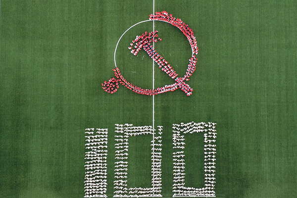 太极拳队伍与舞蹈队伍共同变换出党徽与“100”的字样,献上浙师对中国共产党百年诞辰的美好祝福。