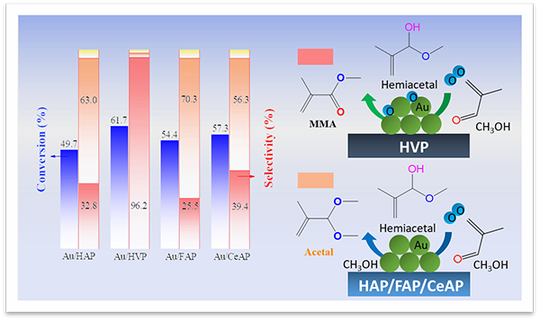 负载型金催化剂被报道在氧化酯化反应中展现出良好的潜力,并且其催化性能强烈依赖于粒径和载体等因素。本课题组在前期研究工作中,报道了粒径和载体等因素对金催化氧化酯化反应性能的影响,并通过调变金与载体的相互作用或者载体的组分性质对催化剂的性能进行调变(Catalysts, 2021, 11, 162; Int. J. Mol. Sci., 2021, 22, 8668)。本工作以原子数可控的Au25原子团簇作为金的前驱体,以阴阳离子可交换的羟基磷灰石(HAP, Ca5(PO4)3(OH))作为载体,进一步研究载体因素对金催化醛/醇氧化酯化反应性能的影响。结果发现,由VO43-取代PO43-制得的羟基磷灰石(HVP)负载的金催化剂相较于其它阴阳离子(Ce3+, F-)取代的HAP负载的金催化剂在MAL直接氧化酯化反应中表现出更优异的活性和选择性。原位红外光谱表征证明在Au25/HVP催化剂上,MAL可以快速转化为MMA,而在Au25/HAP,Au25/FAP和Au25/CeAP催化剂上,MAL只能转化为缩醛。HRTEM、XPS、O2-TPD等表征证明金的粒径、电子态,以及载体的性质等可能对氧的吸附活化能力产生影响。结合表征结果和对照试验可以推断反应活性中心位于金与载体的界面处。采用固定床反应器对Au25/HVP催化剂的稳定性进行测试,发现反应装置连续运转140h,催化剂可以保持稳定。上述工作为研究负载型金催化剂一步氧化酯化反应提供了思路和方法。