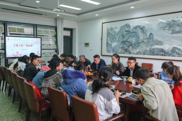 “大家边吃边聊,不用拘谨。”11月的第一周,人文学院四楼会议室,一场特殊的午餐会正在进行。摆放整齐的盒饭与大屏“午餐上的‘思政课’”字样,交谈声与进餐声,老师与同学,在“餐桌”上意外地交织出一幅和谐的画面。