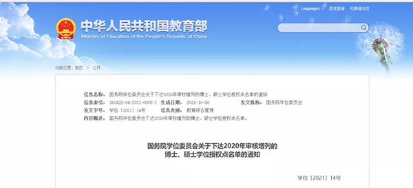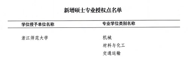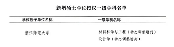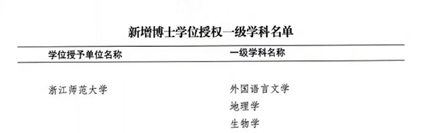 近日,国务院学位委员会下发了《关于下达2020年审核增列的博士、硕士学位授权点名单的通知》(学位〔2021〕14号)和《关于下达2020年动态调整撤销和增列的学位授权点名单的通知》(学位〔2021〕15号),浙师大增列外国语言文学、地理学、生物学3个一级学科博士学位授权点,机械、材料与化工、交通运输3个硕士专业学位授权点;通过动态调整增列材料科学与工程、设计学2个一级学科硕士学位授权点。