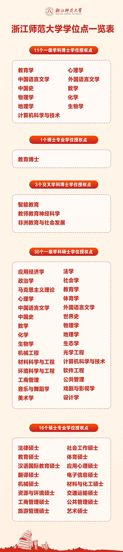 至此,浙师大拥有教育学、心理学、中国语言文学、外国语言文学、中国史、数学、物理学、化学、地理学、生物学、计算机科学与技术11个一级学科博士学位授权点,1个教育博士专业学位授权点,智能教育、教师教育神经科学、非洲教育与社会发展3个教育部备案的交叉学科博士学位授权点,涵盖教育学、文学、历史学、理学、工学5个学科门类。同时拥有30个一级学科硕士学位授权点和16个硕士专业学位授权点,涵盖经济学、法学、教育学、文学、历史学、理学、工学、管理学、艺术学9个学科门类。