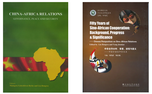 上排左图为《中非关系:治理、和平和安全》;上排右图为《中非合作五十年:背景、进程与意义》;下排左图为《中非智库论坛十年发展报告》;下排右图为《中非发展合作:理论、战略与政策研究》