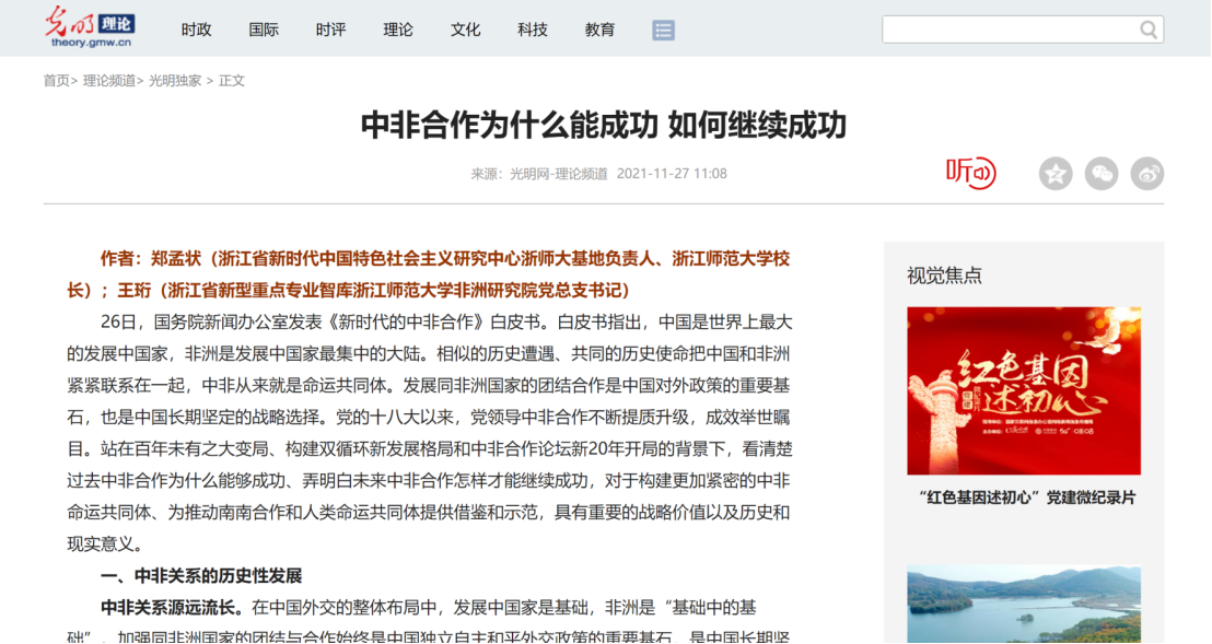 11月27日,光明网理论频道刊发浙江省新时代中国特色社会主义研究中心浙师大基地负责人、浙江师范大学校长郑孟状教授,浙师大基地中非人文交流研究中心负责人、非洲研究院党总支书记王珩教授撰写的文章《中非合作为什么能成功 如何继续成功》。这也是浙江省新时代中国特色社会主义研究中心浙师大基地成立后产出的首批研究成果。