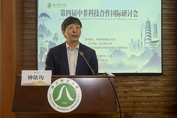 钟依均致欢迎辞,他回顾了浙师大为推动中非合作建设“一带一路”所作的努力和取得的丰硕成果,并简单介绍了浙师大地理、环境等学科的发展情况。钟依均指出,浙师大积极把握中非关系不断深化的大好形势,主动服务国家外交战略,着力推进中非交流合作,形成了非洲学术研究、汉语国际推广、涉非人才培养、对非校际交流四大领域良性互动、整体推进的工作格局。钟依均表示,此次会议是对11月29日中非合作论坛的会议精神在科技、生态环境领域的落实,中国科协一带一路国际科学组织合作平台建设项目中非典型生态脆弱区可持续发展联合研究与培训中心是浙师大获得的又一重大平台,必将进一步深化中非科技的交流互动,进一步推动中非全面战略合作伙伴关系高水平发展。