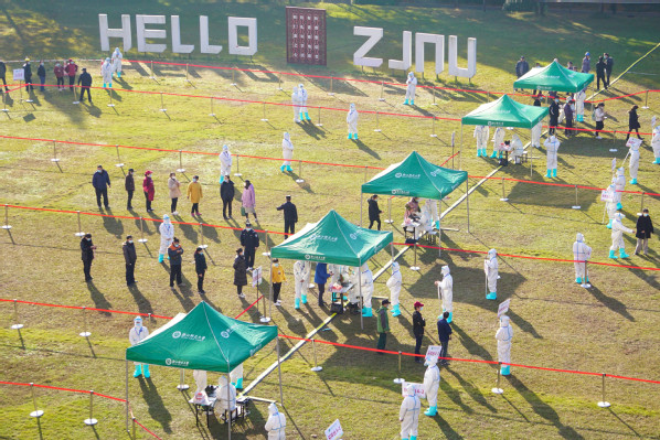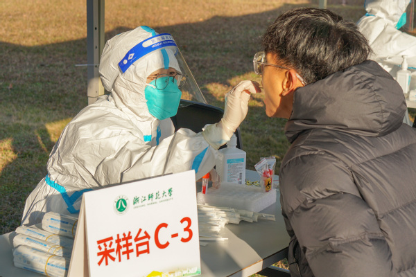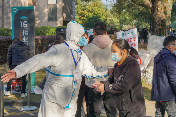 12月2日上午,浙江师范大学核酸检测演练在学校16幢精业楼前的草坪上展开。浙师大党委副书记、防控办主任朱坚到场观摩并发表讲话。