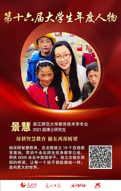 景慧,浙江师范大学教育技术学在读博士生,曾获中国大学生“自强之星”、浙江省高校“优秀共产党员”、浙江省“十佳大学生”、浙江省大学生创业典型人物等荣誉。她深耕智慧教育,投身教育扶贫。生长于青藏高原,远赴浙江求学,成立省级民非组织,创办教育创业公司,带动千余名师生志愿者加入公益,用专业知识助力乡村振兴。带领团队多次前往青海、新疆等地支教,在全国建立了19个在线教育基地,帮扶8000余名中西部学子,助力教育脱贫。事迹得到了中央电视台、《人民日报》《中国青年报》等百余家媒体宣传报道,项目荣获教育部“全国志愿者扶贫十佳案例”、国务院扶贫办“中国志愿者扶贫案例50佳”。