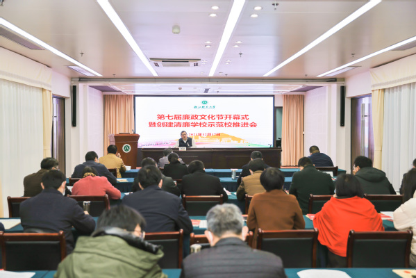12月17日,浙师大第七届廉政文化节开幕式暨创建清廉学校示范校推进会在行政中心多功能厅举办。省监察专员、校党委委员、纪委书记傅关福出席会议并讲话。