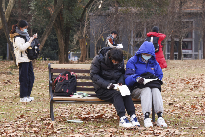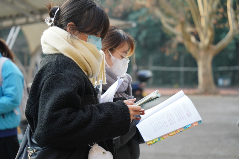 考生们在考场前看书复习。浙师大融媒体中心记者 张程彦 摄