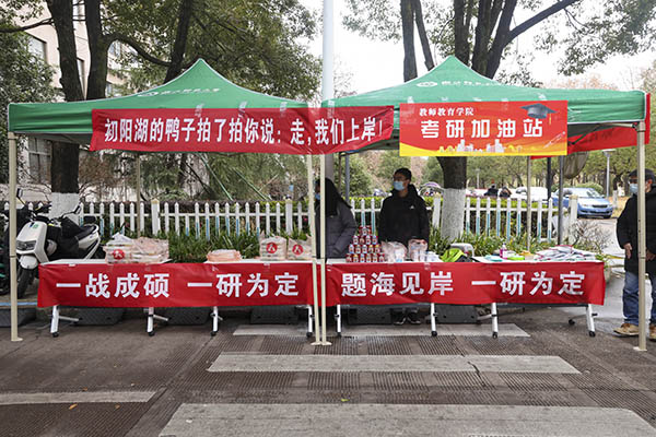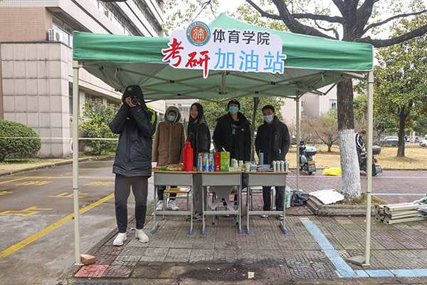 考场附近,经管学院、教育学院、体育学院等二级学院专门设置“考研加油站”,为考生们准备了考研必备物资,面包、牛奶、水果等食物,将学院的暖心关怀传递给各位考生。