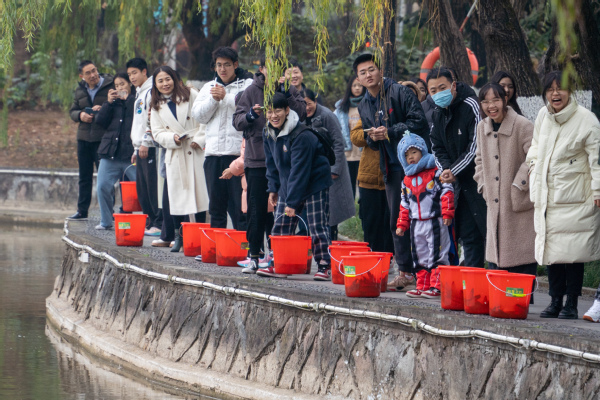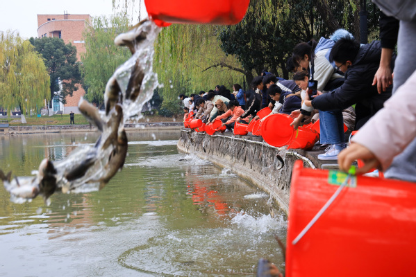 在浙师大初阳湖养鱼节·“鱼”你有约师生互动活动现场,初阳湖水域管理员带领师生一起,有序进行鱼苗放养,共放养了1000斤白鲢鱼苗和500斤花鲢鱼苗,给初阳湖带来了新年的勃勃生机。