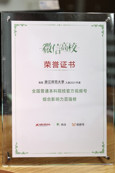 近日,教育部中国大学生在线发布2021年度全国高校官方视频号百强榜。浙江师范大学官方视频号荣获“2021年度官方视频号综合影响力百强”。