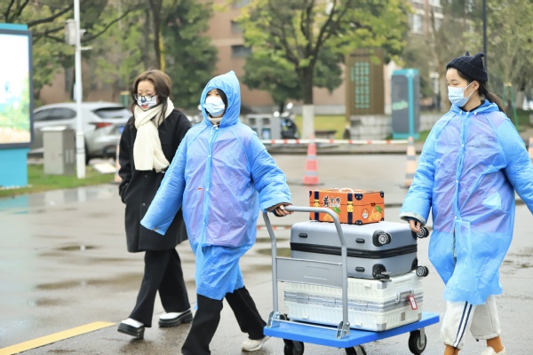 不管是刮风还是下雨,身着红马甲的志愿者们依然奔走在校园里,他们有主动报名的党员教师,有提前返校的学生干部,忙碌在每一个重要的岗位,引导、登记、查验、搬运行李,给返校的同学们带来冬日的暖意。
