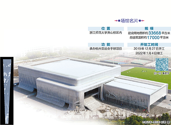 钱塘江南岸、水博园东侧,一座灰白色的建筑在蓝天的映衬下格外引人注目。近日,记者走进位于浙江师范大学萧山校区内的杭州亚运手球馆探访。杭州亚运会手球馆是本届亚运会全部12个新建场馆中唯一位于高校内的竞赛场馆,将承办杭州亚运会手球项目比赛。