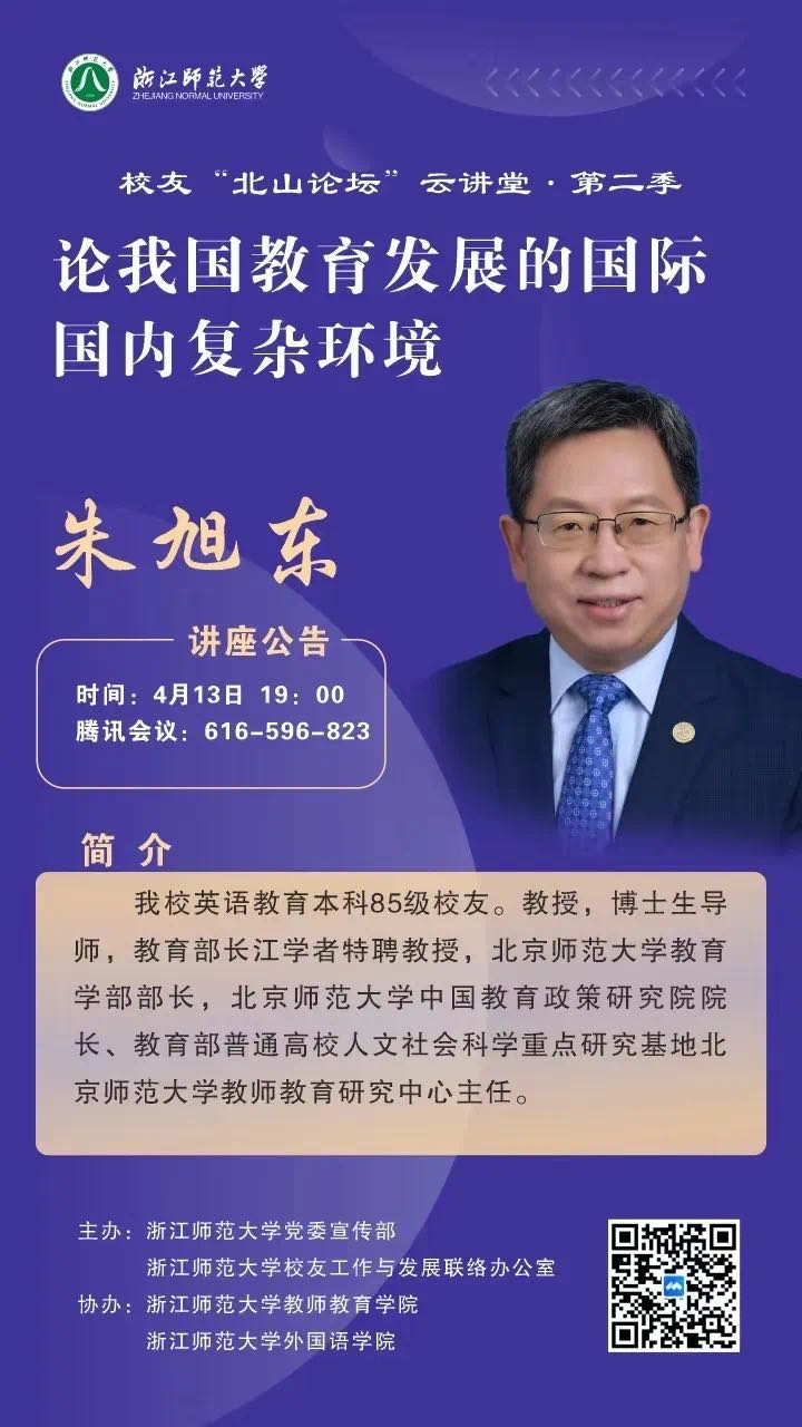 4月13日晚,浙师大校友“北山论坛”云讲堂第三讲开讲。浙师大英语教育本科85级校友、北京师范大学教育学部部长朱旭东教授为师生们带来《论我国教育发展的国际国内复杂环境》的精彩讲座。